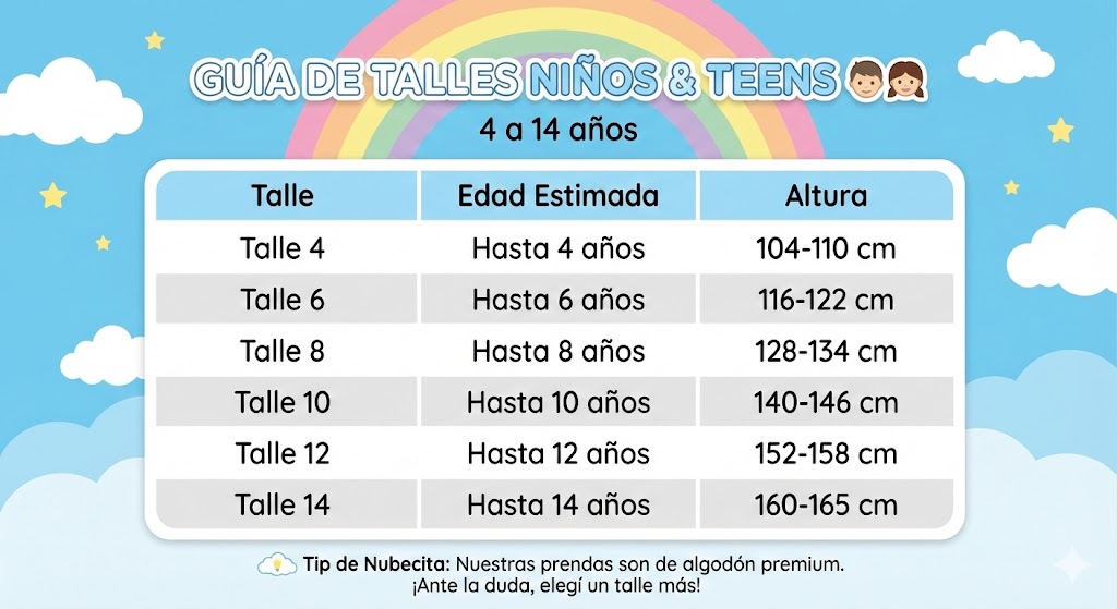 💡 Tip de Nubecita: Nuestras prendas son mayormente de algodón premium. Te sugerimos siempre elegir un talle más si el peque está justo en el límite de la tabla.